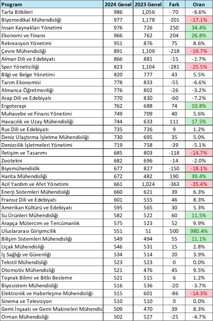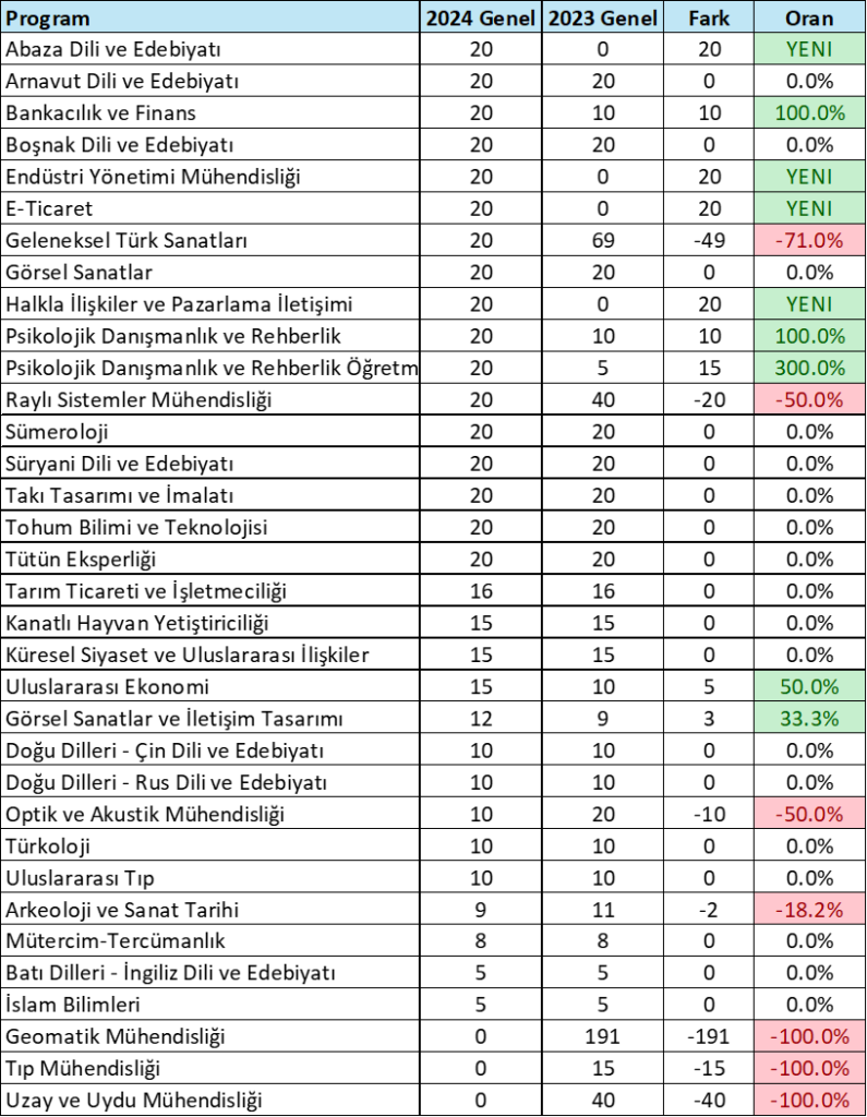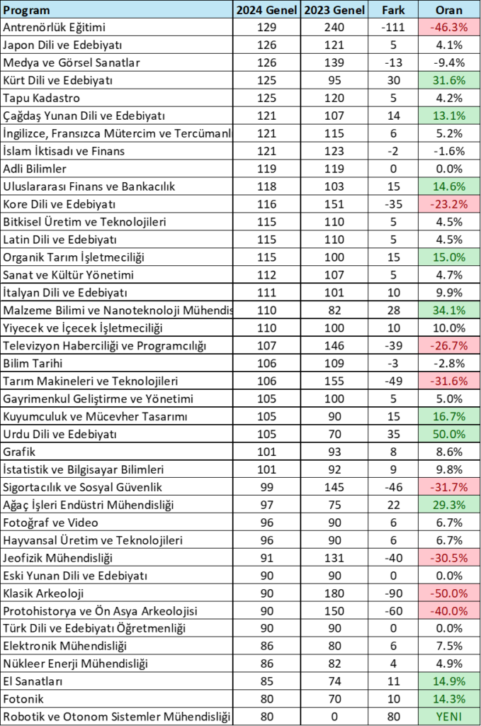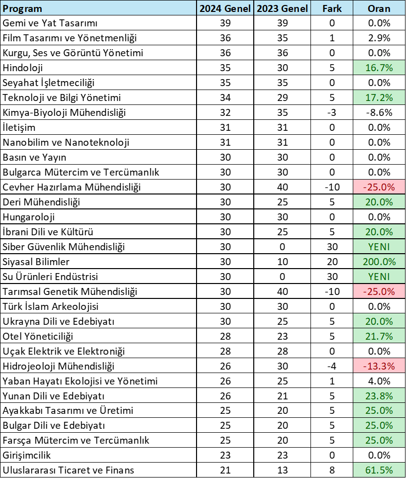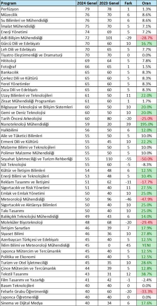 Kontenjanı %10’dan fazla artanlar yeşil, %10’dam fazla eksilenler ise kırmızı ile işaretlenmiştir.