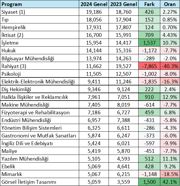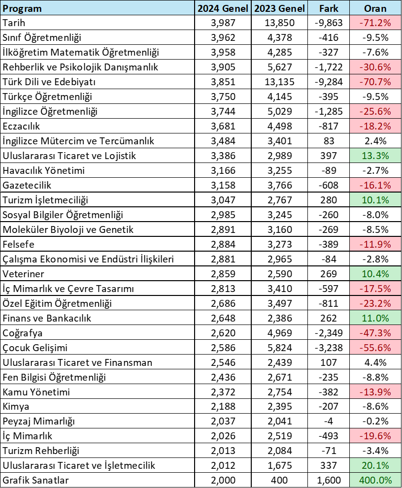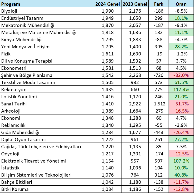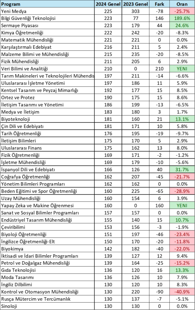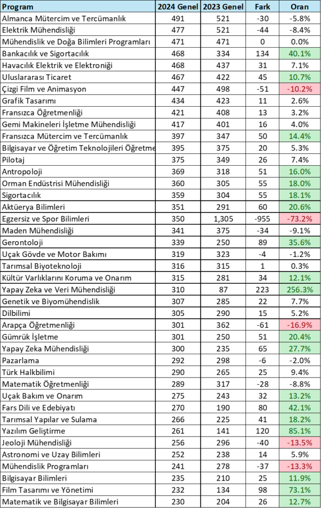 Kontenjanı %10’dan fazla artanlar yeşil, %10’dam fazla eksilenler ise kırmızı ile işaretlenmiştir.
